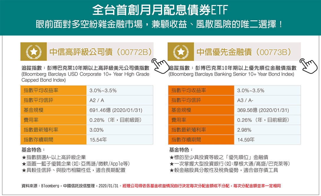 BLOOMBERG®乃為彭博財經有限合夥企業及其關係企業(統稱「彭博」)之商標與服務標記。BARCLAYS®乃為英商巴克萊銀行之商標與服務標記(與其關係企業統稱「巴克萊」),且經授權使用之。彭博或彭博之授權人,包括巴克萊,擁有彭博巴克萊指數之完整專屬權利。彭博或巴克萊與中國信託投信無附屬關係,且對中國信託多元收益債券ETF傘型證券投資信託基金之中國信託彭博巴克萊10年期以上高評級美元公司債券ETF證券投資信託基金及中國信託彭博巴克萊10年期以上優先順位金融債券ETF證券投資信託基金無任何責任、義務或職責。彭博及巴克萊均不就彭博巴克萊10年期以上高評級美元公司債指數及彭博巴克萊10年期以上優先順位金融債指數之即時性、正確性或完整性做出任何擔保,且亦不應對中國信託投信、基金之投資人或任何第三方就使用指數或其間包含任何資料之使用或其正確性承擔任何責任。(詳盡說明請參閱本基金公開說明書)。