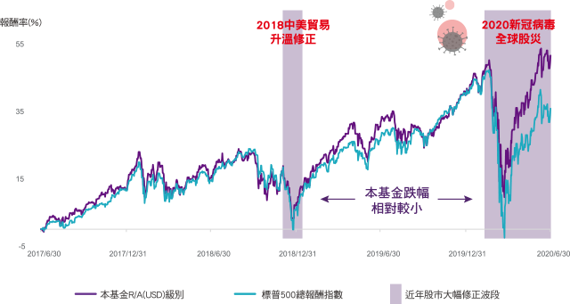 資料來源:Lipper/R累積,同類型為理柏環球分類為美國基金之境外基金,僅計算台灣主基金,美元計價,2020/6/30。過去報酬不代表未來投資獲利之保證。*本基金參考基準指數為S&P500總報酬指數。四分位排名為基金與同類型基金排名百分比,排名前25%為第一分位,之後的25%則為第二分位,其餘類推,共分四個分位。