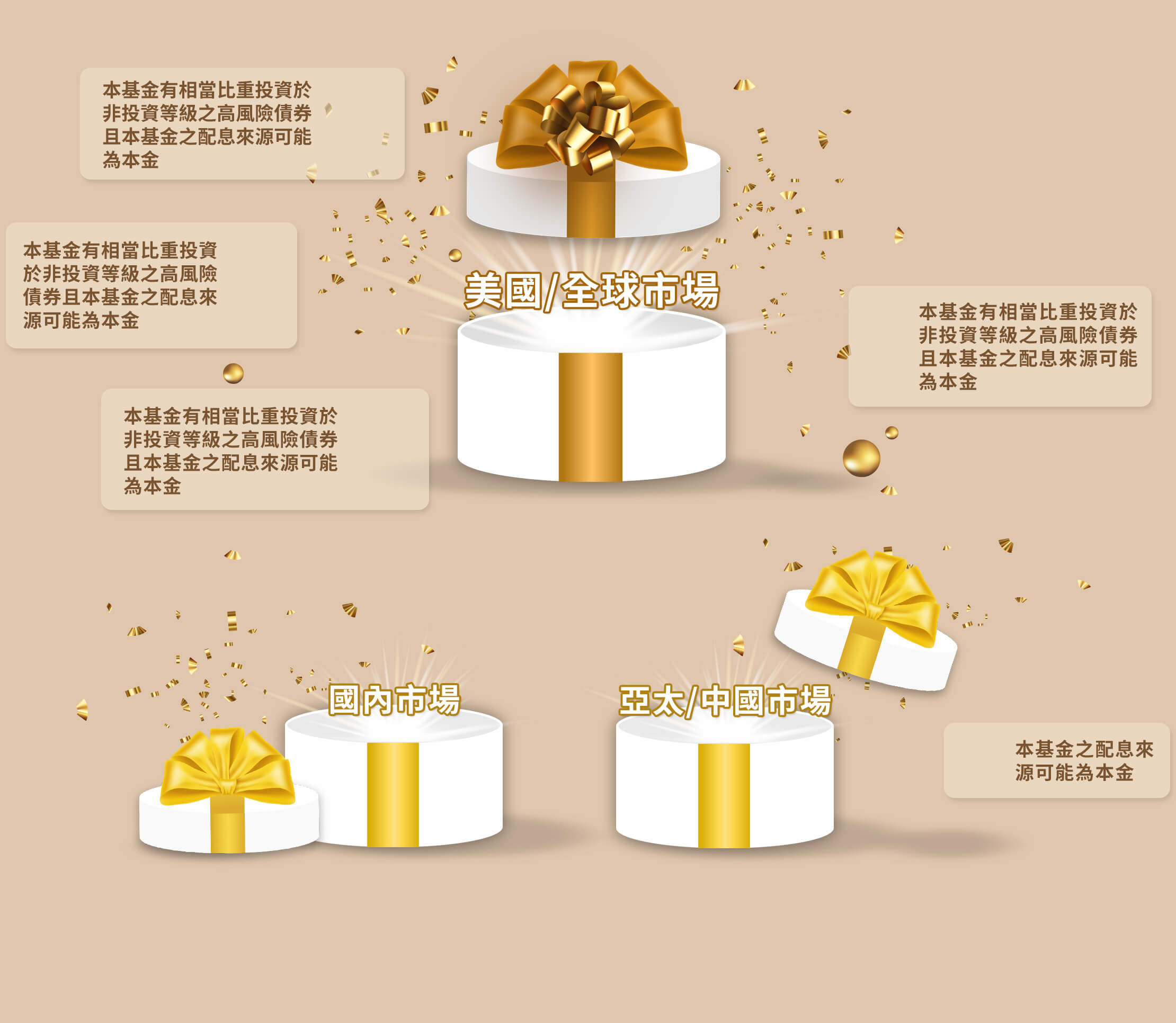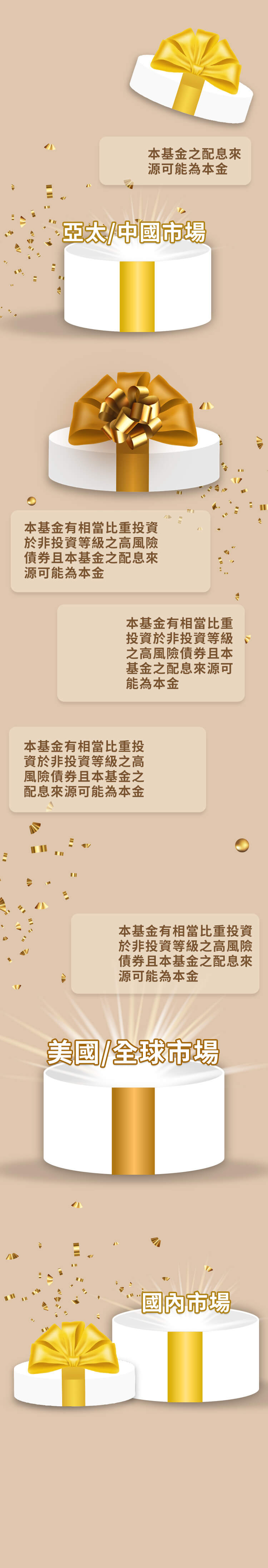 受益人投資遞延手續費之NB類型各計價類別受益憑證者,其手續費之收取將於買回時支付,且該費用將依受益人持有期間而有所不同,其餘費用之計收與前收手續費類型受益憑證相同,亦不加計分銷費用。NB類型各計價類別受益憑證遞延手續費之規定,請詳本基金公開說明書「基金概況/壹、基金簡介/十四、銷售價格」及「基金概況/玖、受益人之權利及費用負擔」之內容。本基金得視市場情況投資非投資等級債券,投資人投資本基金時不宜占其投資組合過高之比重。由於非投資等級債券之信用評等未達投資等級或未經信用評等,且對利率變動的敏感度甚高,本基金可能因利率上升、市場流動性下降或債券發行機構違約不支付利息、本金或破產而蒙受虧損,故本基金不適合無法承受相關風險之投資人。又本基金可投資於美國Rule 144A債券,該債券屬私募性質,故而發行人之財務狀況較不透明,較可能發生流動性不足,財務訊息揭露不完整或因價格不透明導致波動性較大之風險。 本基金之配息級別採每月配息評價機制,基金配息率不代表基金報酬率,且過去配息率不代表未來配息率,基金淨值可能因市場因素而上下波動,於獲配息時須一併注意基金淨值之變動。 基金的配息可能由基金的收益或本金中支付,任何涉及由本金支出的部份,可能導致原始投資金額減損。本基金之配息級別進行配息前未先扣除應負擔之相關費用。有關本基金之配息級別之配息組成項目揭露於本公司網站。本基金投資於基金受益憑證部份可能涉有重複收取經理費。 本基金包含新臺幣及美元計價級別,除法令另有規定或經主管機關核准外,新臺幣計價級別之所有申購及買回價金之收付,均以新臺幣為之;美元計價級別之所有申購及買回價金之收付,均以美元為之。如投資人以非本基金計價幣別之貨幣換匯後申購本基金者,須自行承擔匯率變動之風險。此外,因投資人與銀行進行外匯交易有賣價與買價之差異,投資人進行換匯時須承擔買賣價差,此價差依各銀行報價而定。此外,基金可能投資於各計價幣別的投資標的,當不同幣別間之匯率產生較大變化時,將會影響基金不同計價幣別受益權單位之淨資產價值。另外,投資人亦須承擔匯款費用,且外幣匯款費用可能高於新臺幣匯款費用。為避免因受益人短線交易頻繁,造成基金管理及交易成本增加,進而損及基金長期持有之受益人之權益,並稀釋基金之獲利,本基金不歡迎受益人進行短線交易。投資人應特別留意,本基金因計價幣別不同,投資人申購之受益權單位數為該申購幣別金額除以發行價格計,於召開受益人會議時,各計價幣別受益權單位每受益權單位有一表決權,不因投資人取得各級別每受益權單位之成本不同而異。投資人申購本基金係持有基金受益憑證,而非本文提及之投資資產或標的。