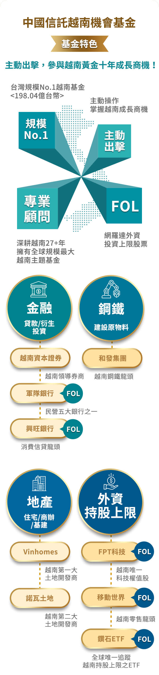 投資涉及新興市場部分,因其波動性與風險程度可能較高,且其政治與經濟情勢穩定度可能低於已開發國家,也可能使資產價值受不同程度之影響。匯率走勢亦可能影響所投資之海外資產而使資產價值變動。本基金包含新臺幣、美元計價級別,如投資人以非本基金計價幣別之貨幣換匯後申購本基金者,須自行承擔匯率變動之風險。本基金主要投資於越南股票,受單一國家市場政經情勢、景氣循環的影響更為直接,因此基金淨值可能有較大幅度的波動。另因越南證券市場屬初期發展階段,其市值及交易量甚小,且本基金因外國投資者之身分,對某些特定證券有持股限制,可能面臨較高之流動性風險。本基金可能面臨之風險包含:類股過度集中及產業景氣循環之風險、流動性風險、外匯管制及匯率變動之風險、政治或經濟變動之風險、商品交易對手之信用風險、其他投資標的或特定投資策略之風險、從事證券相關商品交易之風險、法令環境變動之風險、循滬港通及深港通機制投資大陸地區股票之相關風險及其他投資風險等,本基金所投資標的發生上開風險時,本基金之淨資產價值可能因此產生波動。
