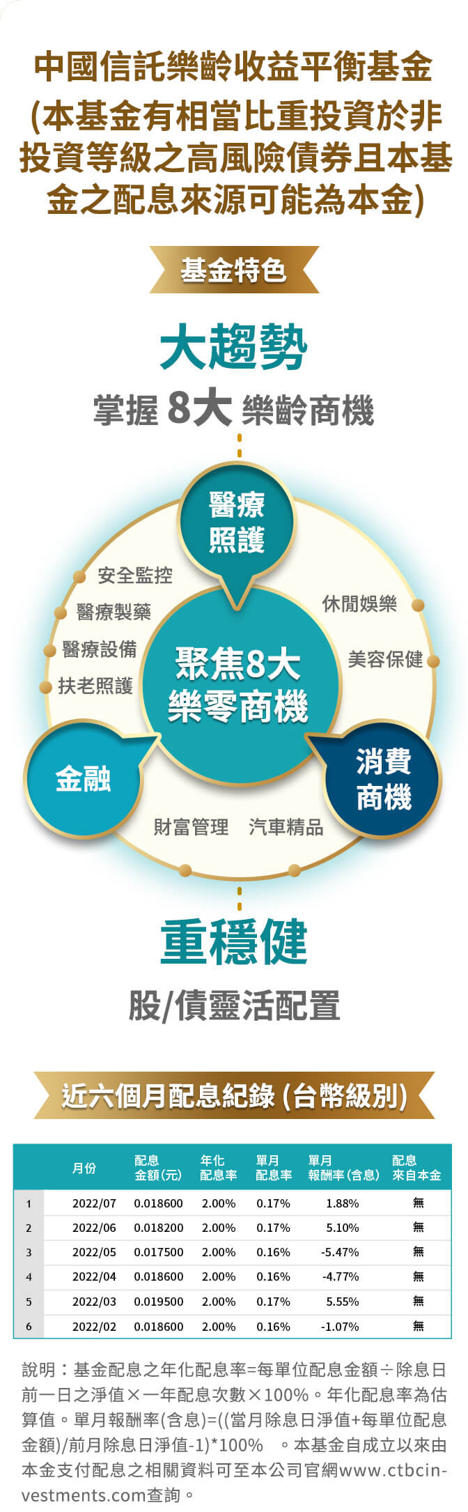 配息型基金配息率不代表基金報酬率,且過去配息率不代表未來配息率,基金淨值可能因市場因素而上下波動,於獲配息時須一併注意基金淨值之變動。基金的配息可能由基金的收益或本金中支付,任何涉及由本金支出的部份,可能導致原始投資金額減損。且因現金股利之配發時間及金額將視個別企業而定,基金係依所投資標的之除息基準日認列股利收入,並於每月終了後,依帳列記錄計算可分配收益,故月配息金額非固定且配息機制可能侵蝕本金。基金進行配息前未先扣除應負擔之相關費用(包含經理費、保管費及其他相關費用等)。投資人可至本公司官網查詢最近配息組成項目。基金配息之年化配息率為估算值,計算公式為「每單位配息金額÷除息日前一日之淨值×一年配息次數×100%」。各期間報酬率(含息)是假設收益分配均滾入再投資於本基金之期間累積報酬率。
