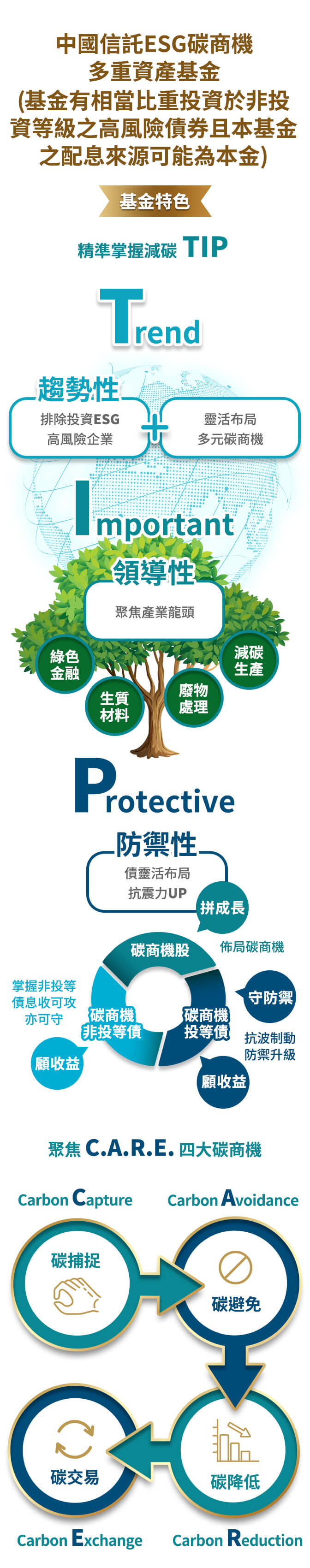 中國信託ESG碳商機多重資產基金,有關ESG主題的篩選邏輯須依賴第三方ESG評鑑機構取得的資料及數據來評估某一有價證券或發行人,而該等資料及數據可能並不完整、不準確或無法取得,而存在依賴該等資料或數據評估相關之風險。ESG投資在某程度上而言是主觀的,不保證基金所作的投資將會反映任何特定投資者的信仰或價值觀。基金的投資政策將採用以ESG為基礎的剔除標準,若干產業可能被排除,包括色情、賭場和博弈、軍火、未具有碳數據或碳政策揭露有關產業之企業及本公司所制定基於考量環境、社會與公司治理所需排除之投資企業名單。但所排除的相關產業未必直接與投資者本身主觀的倫理觀點相符。本基金以「ESG碳商機」主題為投資訴求,或可能或侷限本基金之其他投資機會,或當所持有價證券的ESG碳商機投資特徵改變,導致必須出售該有價證券。本基金可能因基金投資方針聚焦於「ESG碳商機」主題而影響本基金之投資表現。有關基金之ESG資訊,投資人應於申購前詳閱基金公開說明書或投資人須知所載之基金所有特色或目標等資訊。