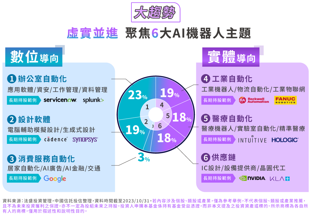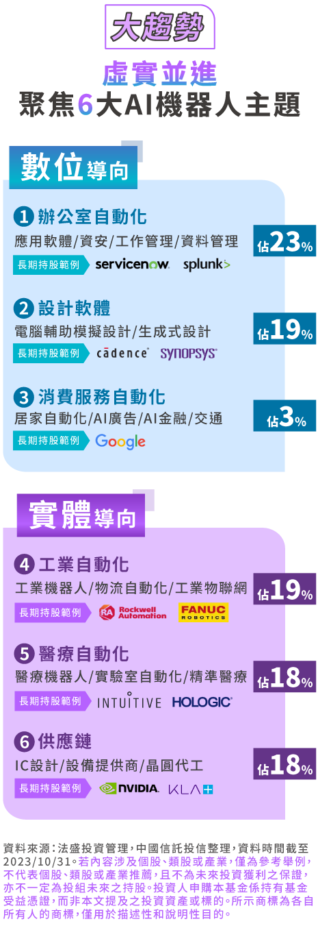 ServiceNow提供雲端平台協助公司管理企業營運的數位工作流程,在工作流程管理軟體領域全球市佔率第一。軟體內建AI處理建議,平均提升30%員工生產力。2023年與Nvidia合作,將企業IT領域構建生成式人AI應用,提升流程自動化。